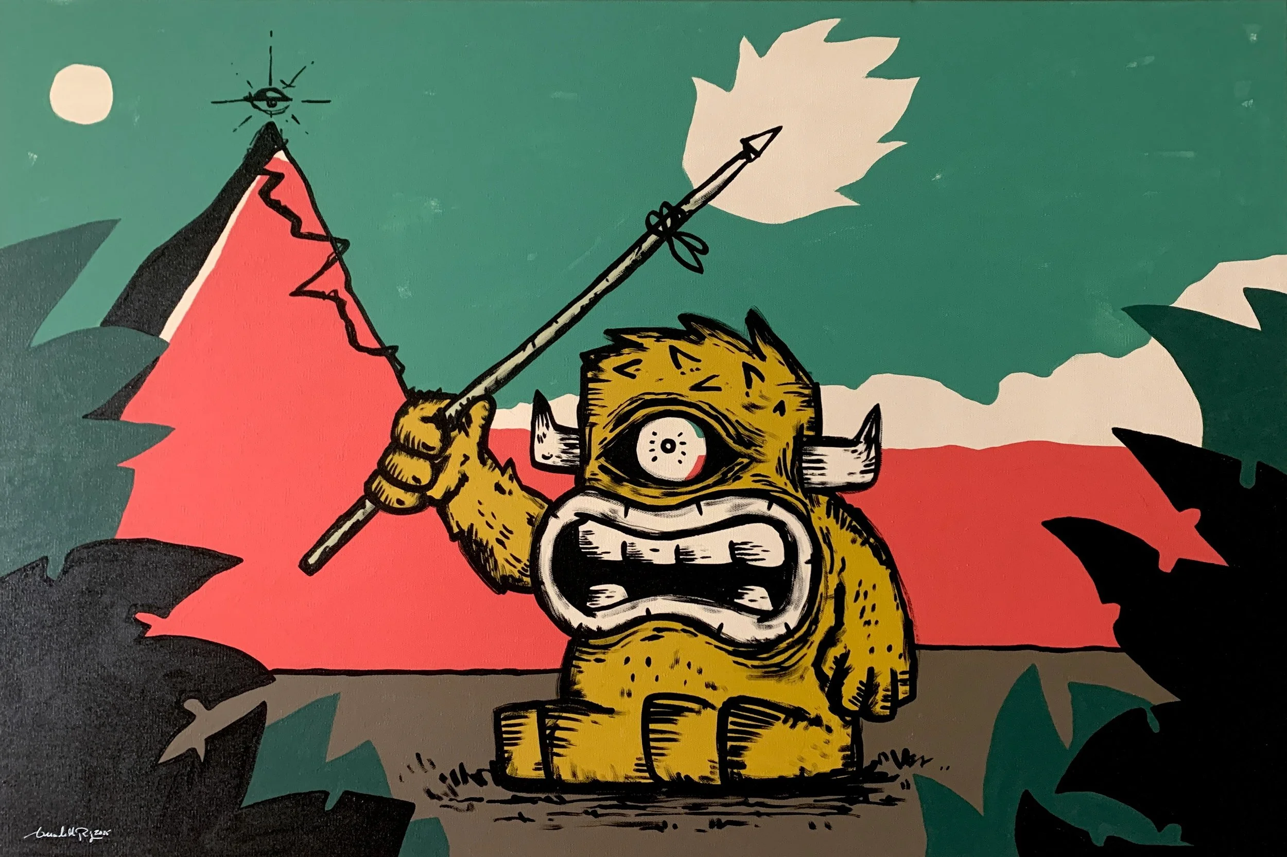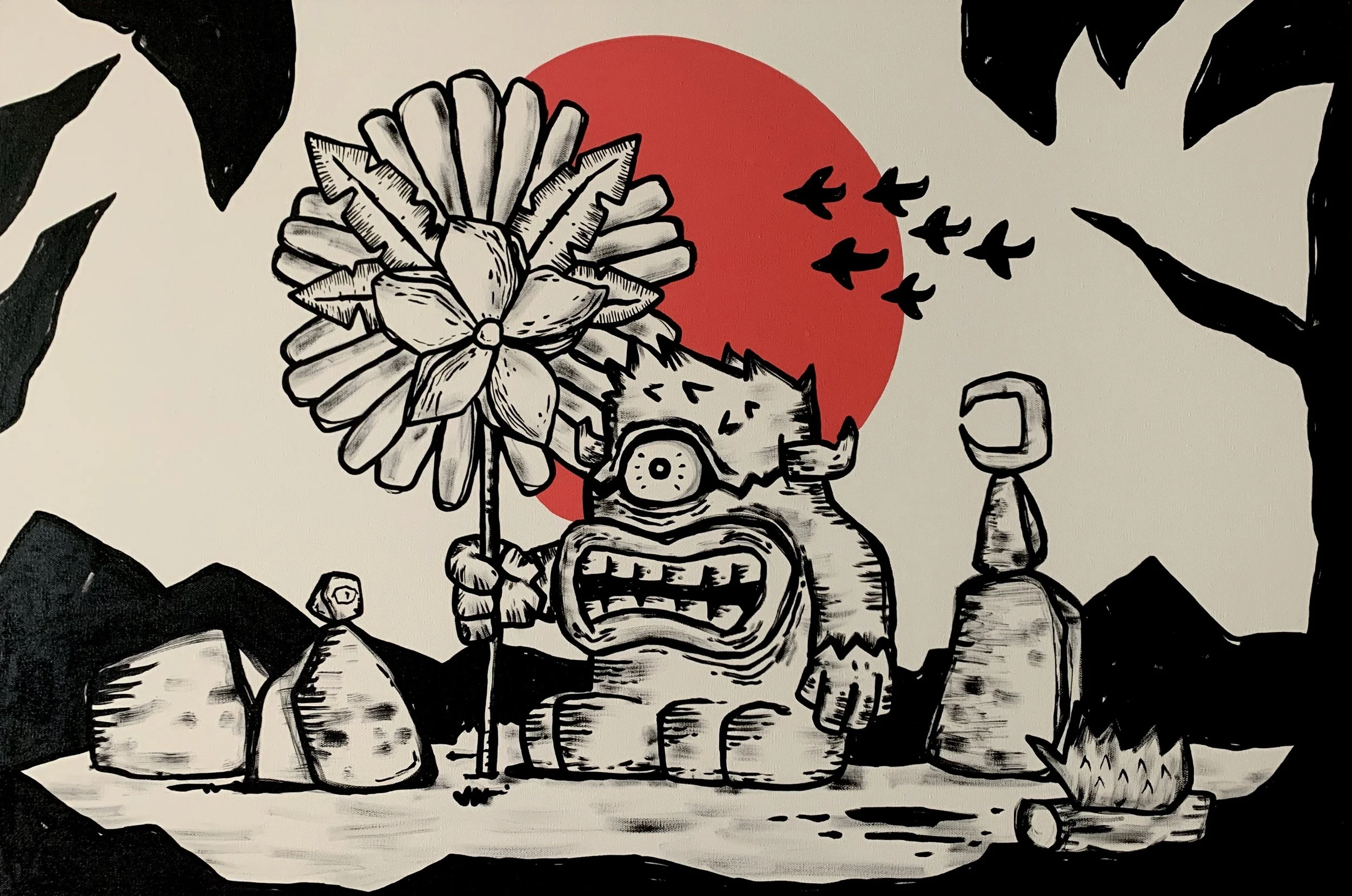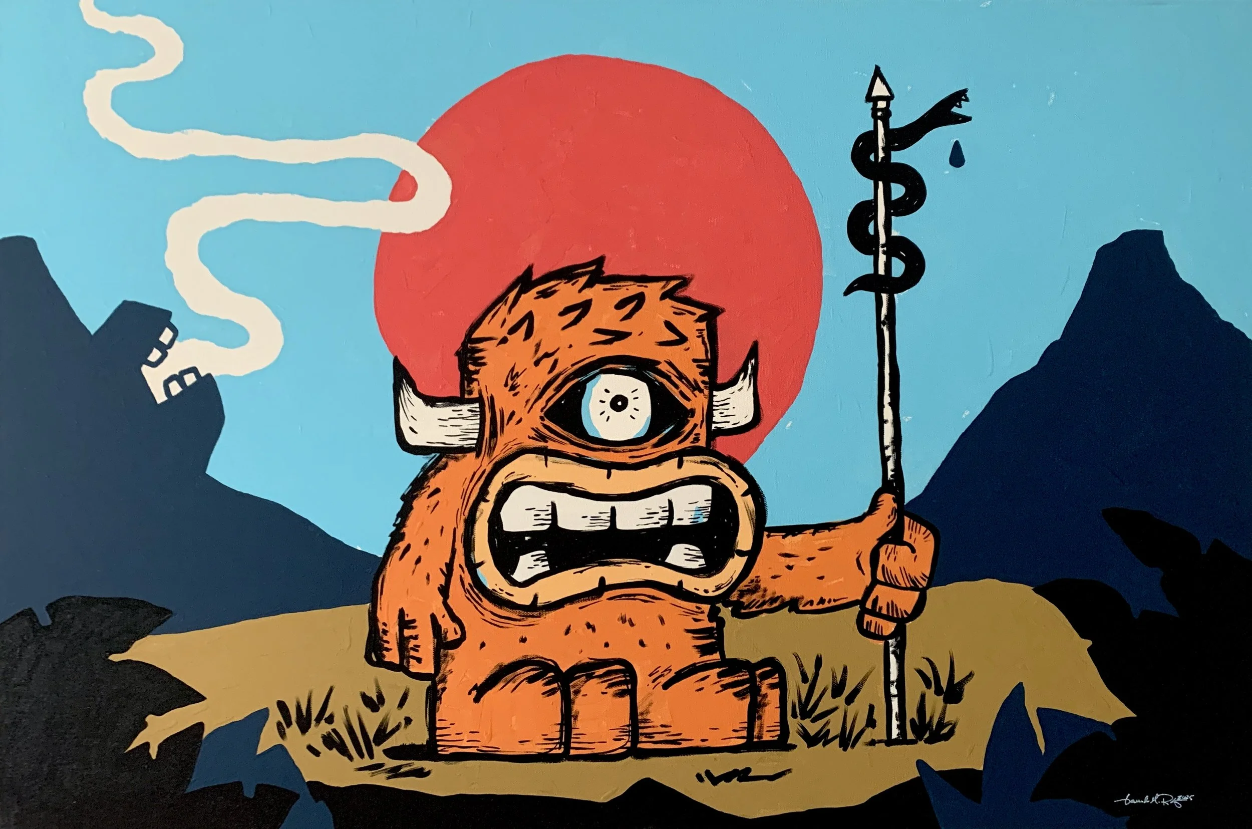 As I followed my winged guides, a curious obstacle halted my journey. A stone cyclops head lay in front of me, and– just beyond it– shadowed figures of either my fearful imagination or a threatening presence. The monster rock felt my pause– or something did– and a crack of magic sparked from my staff. With an electric sizzle I was suddenly magnetized by the one-eyed boulder, and as the current buzzed between us a sword ascended from the awakened boulder. The sword blazed blue against the smokey orange sky, and the firelight of my lantern sparkled off the blade: I was chosen.