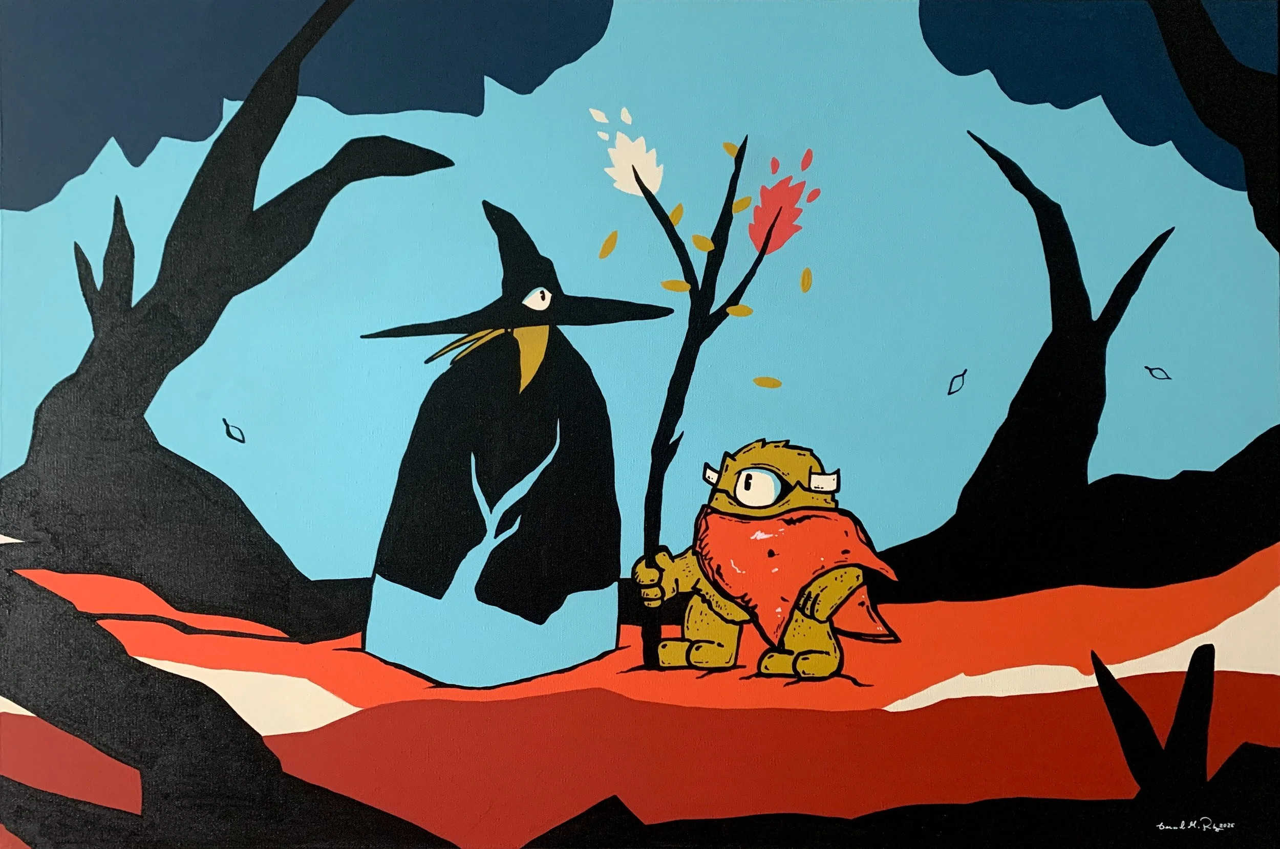 In the ruins of troubled paradise, the skies were choked with ash and the vines were drained of their vibrant greens. Like a ghost haunting the wasteland, a figure weaved between deadened branches, and as it approached me the earthen floor lifted to meet it in anticipation. It was a being cloaked and dark, but its presence was inviting and bright. Though its voice spoke not, I heard a spell whispered to my soul, like familiar words in a foreign tongue. Then, magic! Like sparklers, energy began to fizz from the branch in my hand and where sparks landed things began to sprout. As I waved the branch through the forest, the sprinkling of sparks ignited life. The spell cast upon me was now my spell to cast back: nature began to restore and paradise began again.